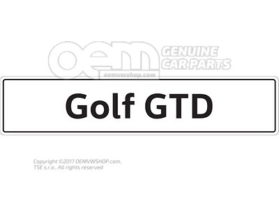 Viac v popise produktuThe car type plate features the "Golf GTD" lettering in black on a white background.